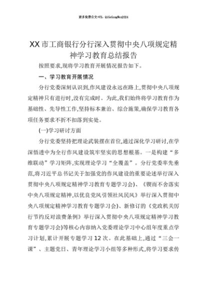 【七哥公文】2025年:【七哥公文】XX市工商银行分行深入贯彻中央八项规定精神学习教育总结报告+更多免费公文+VX:QiGeGongWen2024+更多免费公文+VX:QiGeGongWen2024