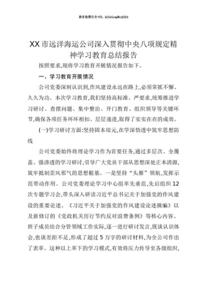 【七哥公文】2025年:【七哥公文】XX市远洋海运公司深入贯彻中央八项规定精神学习教育总结报告+更多免费公文+VX:QiGeGongWen2024+更多免费公文+VX:QiGeGongWen2024