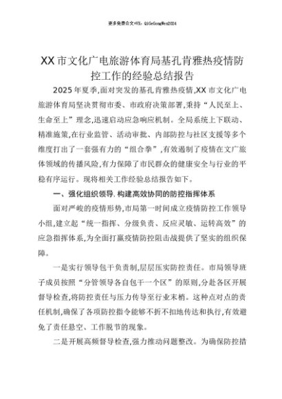 【七哥公文】2025年:【七哥公文】XX市文化广电旅游体育局基孔肯雅热疫情防控工作的经验总结报告+更多免费公文+VX:QiGeGongWen2024+更多免费公文+VX:QiGeGongWen2024