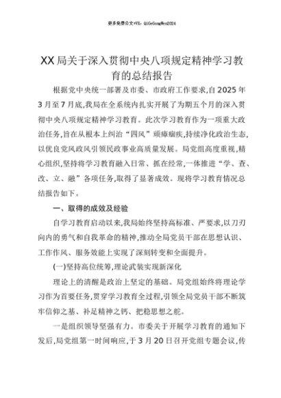 【七哥公文】2025年:【七哥公文】XX局关于深入贯彻中央八项规定精神学习教育的总结报告+更多免费公文+VX:QiGeGongWen2024+更多免费公文+VX:QiGeGongWen2024