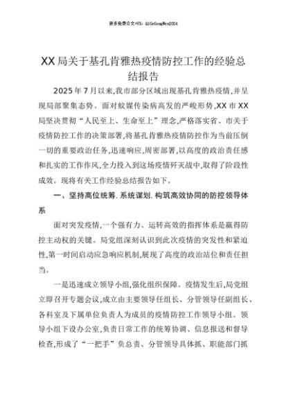 【七哥公文】2025年:【七哥公文】XX局关于基孔肯雅热疫情防控工作的经验总结报告+更多免费公文+VX:QiGeGongWen2024+更多免费公文+VX:QiGeGongWen2024