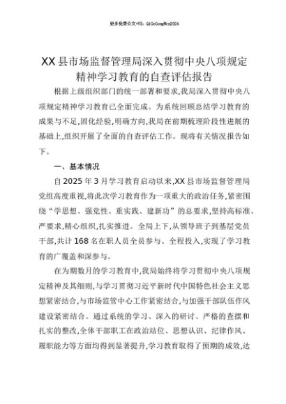 【七哥公文】2025年:【七哥公文】XX县市场监督管理局深入贯彻中央八项规定精神学习教育的自查评估报告+更多免费公文+VX:QiGeGongWen2024+更多免费公文+VX:QiGeGongWen2024