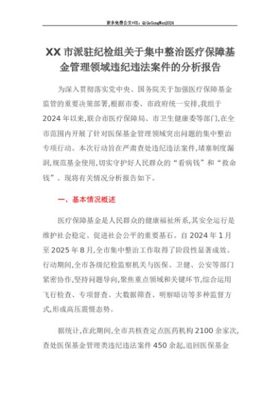 【七哥公文】2025年:【七哥公文】XX市派驻纪检组关于集中整治医疗保障基金管理领域违纪违法案件的分析报告+更多免费公文+VX:QiGeGongWen2024+更多免费公文+VX:QiGeGongWen2024