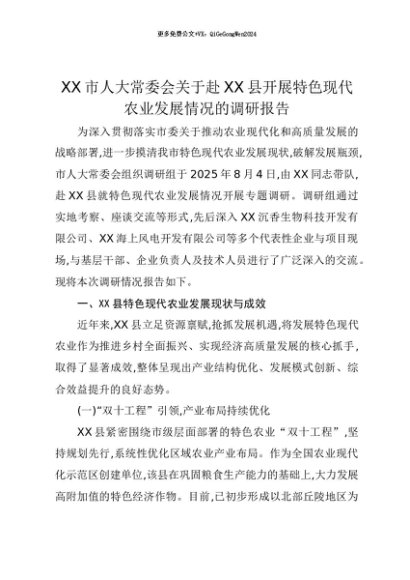 【七哥公文】2025年:【七哥公文】XX市人大常委会关于赴XX县开展特色现代农业发展情况的调研报告+更多免费公文+VX:QiGeGongWen2024+更多免费公文+VX:QiGeGongWen2024