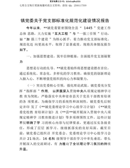【七哥公文】2025年:【七哥公文】镇X委关于X支部标准化规范化建设情况报告+更多免费公文+VX:QiGeGongWen2024+更多免费公文+VX:QiGeGongWen2024