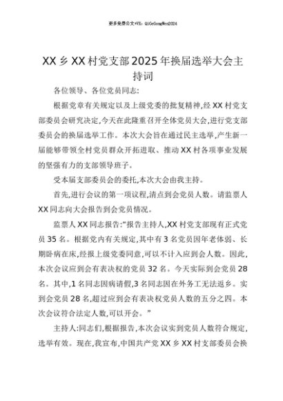 【七哥公文】2025年:【七哥公文】XX乡XX村党支部2025年换届选举大会主持词+更多免费公文+VX:QiGeGongWen2024+更多免费公文+VX:QiGeGongWen2024