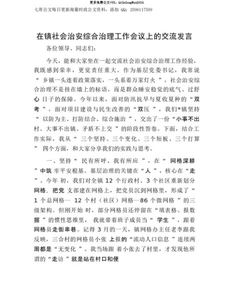 【七哥公文】2025年:【七哥公文】在镇社会治安综合治理工作会议上的交流发言+更多免费公文+VX:QiGeGongWen2024+更多免费公文+VX:QiGeGongWen2024