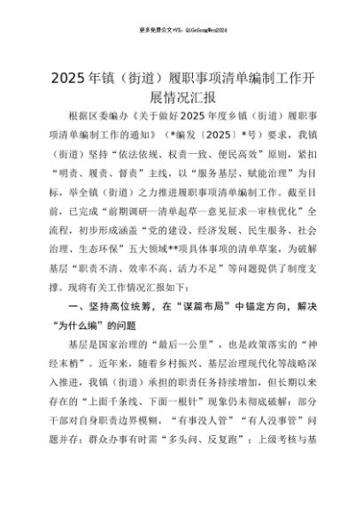 【七哥公文】2025年:【七哥公文】2025年镇(街道)履职事项清单编制工作开展情况汇报+更多免费公文+VX:QiGeGongWen2024+更多免费公文+VX:QiGeGongWen2024