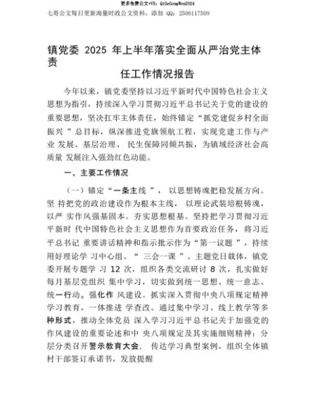 【七哥公文】2025年:【七哥公文】镇X委2025年上半年落实全面从严治X主体责任工作情况报告+更多免费公文+VX:QiGeGongWen2024+更多免费公文+VX:QiGeGongWen2024