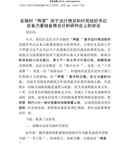 【七哥公文】2025年:【七哥公文】在镇村“两委”班子运行情况和村X组织书记后备力量储备情况分析研判会上的讲话+更多免费公文+VX:QiGeGongWen2024+更多免费公文+VX:QiGeGongWen2024