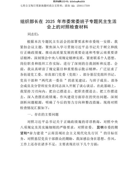 【七哥公文】2025年:【七哥公文】组织部长在2025年市委常委班子专题民主生活会上的对照检查材料+更多免费公文+VX:QiGeGongWen2024+更多免费公文+VX:QiGeGongWen2024