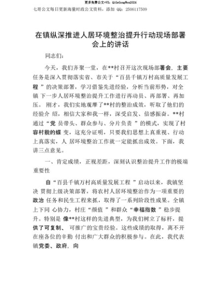 【七哥公文】2025年:【七哥公文】在镇纵深推进人居环境整治提升行动现场部署会上的讲话+更多免费公文+VX:QiGeGongWen2024+更多免费公文+VX:QiGeGongWen2024