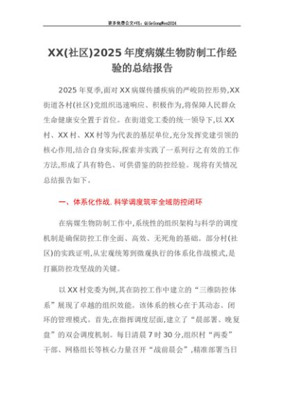 【七哥公文】2025年:【七哥公文】XX(社区)2025年度病媒生物防制工作经验的总结报告+更多免费公文+VX:QiGeGongWen2024+更多免费公文+VX:QiGeGongWen2024
