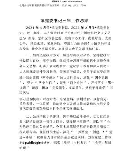 【七哥公文】2025年:【七哥公文】镇X委书记三年工作总结+更多免费公文+VX:QiGeGongWen2024+更多免费公文+VX:QiGeGongWen2024