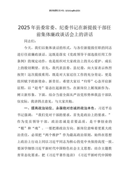 【七哥公文】2025年:【七哥公文】2025年县委常委、纪委书记在新提拔干部任前集体廉政谈话会上的讲话+更多免费公文+VX:QiGeGongWen2024+更多免费公文+VX:QiGeGongWen2024
