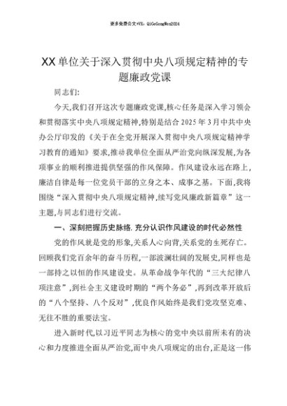 【七哥公文】2025年:【七哥公文】XX单位关于深入贯彻中央八项规定精神的专题廉政党课+更多免费公文+VX:QiGeGongWen2024+更多免费公文+VX:QiGeGongWen2024
