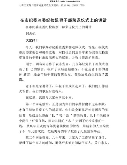 【七哥公文】2025年:【七哥公文】在市纪委监委纪检监察干部荣退仪式上的讲话+更多免费公文+VX:QiGeGongWen2024+更多免费公文+VX:QiGeGongWen2024