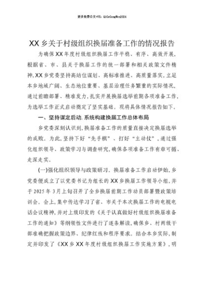 【七哥公文】2025年:【七哥公文】XX乡关于村级组织换届准备工作的情况报告+更多免费公文+VX:QiGeGongWen2024+更多免费公文+VX:QiGeGongWen2024