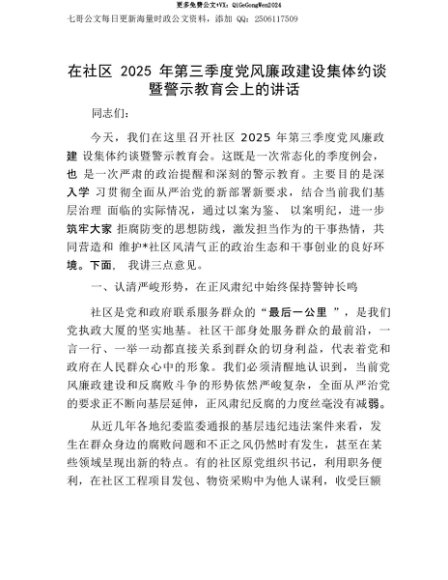 【七哥公文】2025年:【七哥公文】在社区2025年第三季度X风廉政建设集体约谈暨警示教育会上的讲话+更多免费公文+VX:QiGeGongWen2024+更多免费公文+VX:QiGeGongWen2024
