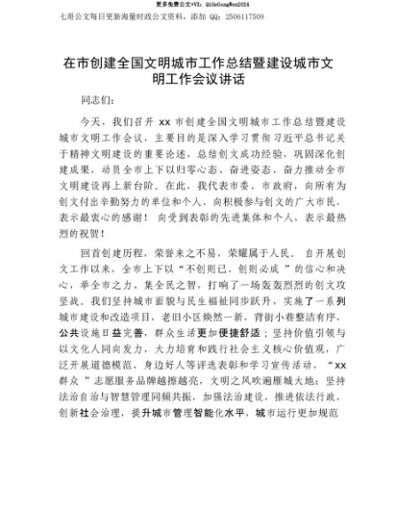【七哥公文】2025年:【七哥公文】在市创建全国文明城市工作总结暨建设城市文明工作会议讲话+更多免费公文+VX:QiGeGongWen2024+更多免费公文+VX:QiGeGongWen2024