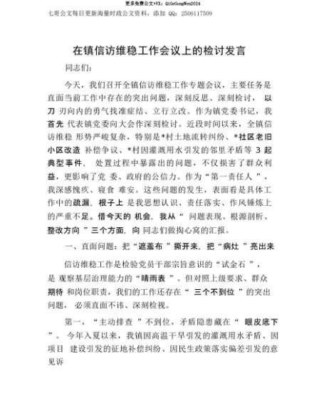 【七哥公文】2025年:【七哥公文】在镇信访维稳工作会议上的检讨发言+更多免费公文+VX:QiGeGongWen2024+更多免费公文+VX:QiGeGongWen2024