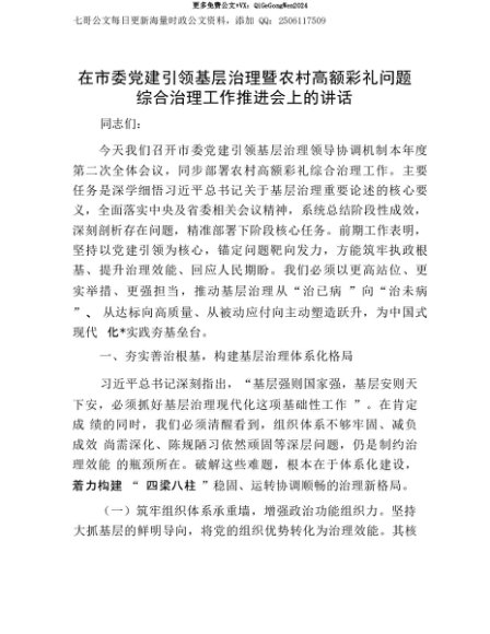 【七哥公文】2025年:【七哥公文】在市委X建引领基层治理暨农村高额彩礼问题综合治理工作推进会上的讲话+更多免费公文+VX:QiGeGongWen2024+更多免费公文+VX:QiGeGongWen2024