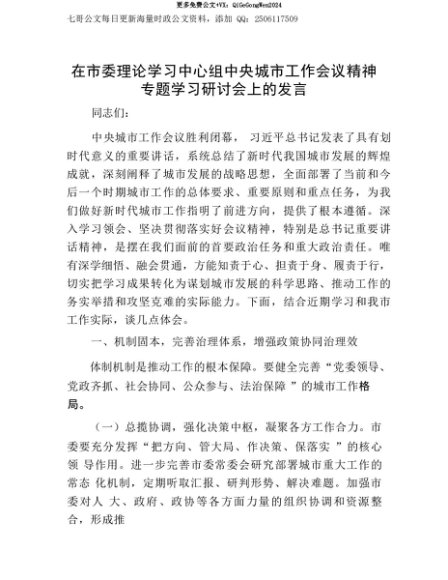【七哥公文】2025年:【七哥公文】在市委理论学习中心组中央城市工作会议精神专题学习研讨会上的发言+更多免费公文+VX:QiGeGongWen2024+更多免费公文+VX:QiGeGongWen2024
