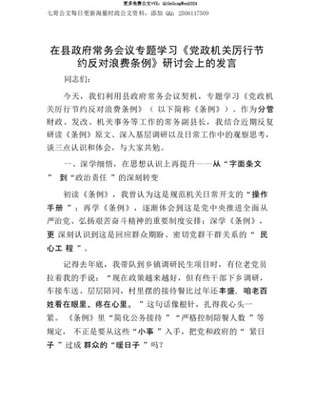 【七哥公文】2025年:【七哥公文】在县政府常务会议专题学习《X政机关厉行节约反对浪费条例》研讨会上的发言+更多免费公文+VX:QiGeGongWen2024+更多免费公文+VX:QiGeGongWen2024