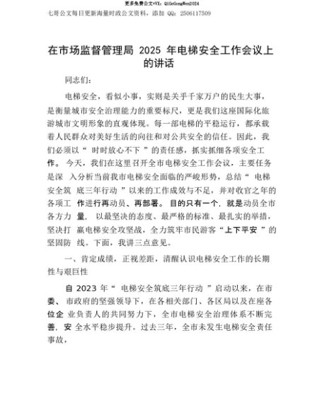 【七哥公文】2025年:【七哥公文】在市场监督管理局2025年电梯安全工作会议上的讲话+更多免费公文+VX:QiGeGongWen2024+更多免费公文+VX:QiGeGongWen2024