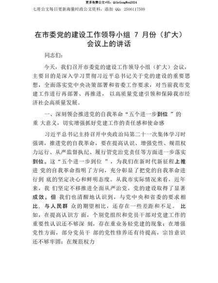 【七哥公文】2025年:【七哥公文】在市委X的建设工作领导小组7月份(扩大)会议上的讲话+更多免费公文+VX:QiGeGongWen2024+更多免费公文+VX:QiGeGongWen2024