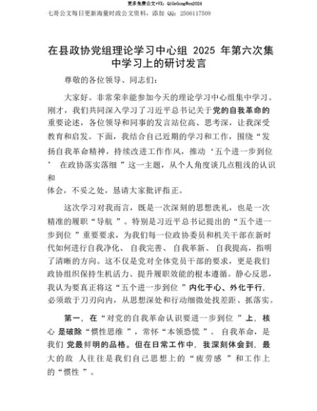 【七哥公文】2025年:【七哥公文】在县政协X组理论学习中心组2025年第六次集中学习上的研讨发言+更多免费公文+VX:QiGeGongWen2024+更多免费公文+VX:QiGeGongWen2024