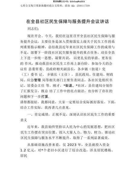 【七哥公文】2025年:【七哥公文】在全县社区民生保障与服务提升会议讲话+更多免费公文+VX:QiGeGongWen2024+更多免费公文+VX:QiGeGongWen2024