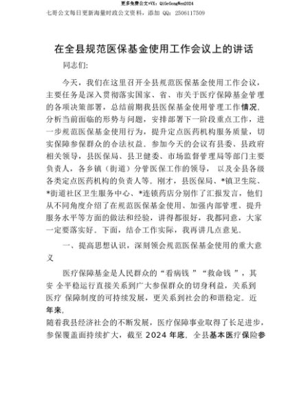【七哥公文】2025年:【七哥公文】在全县规范医保基金使用工作会议上的讲话+更多免费公文+VX:QiGeGongWen2024+更多免费公文+VX:QiGeGongWen2024