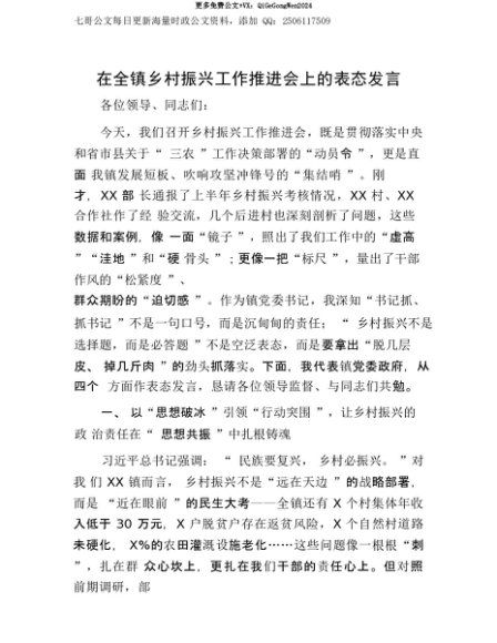 【七哥公文】2025年:【七哥公文】在全镇乡村振兴工作推进会上的表态发言+更多免费公文+VX:QiGeGongWen2024+更多免费公文+VX:QiGeGongWen2024