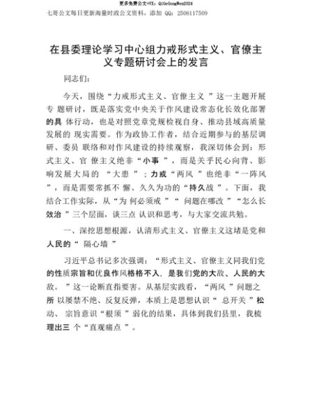 【七哥公文】2025年:【七哥公文】在县委理论学习中心组力戒形式主义、官僚主义专题研讨会上的发言+更多免费公文+VX:QiGeGongWen2024+更多免费公文+VX:QiGeGongWen2024