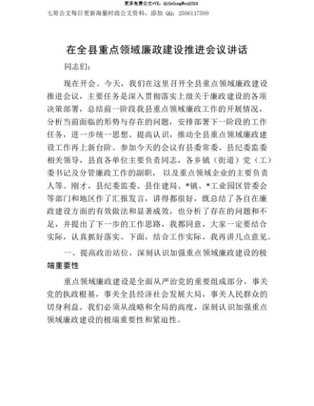 【七哥公文】2025年:【七哥公文】在全县重点领域廉政建设推进会议讲话+更多免费公文+VX:QiGeGongWen2024+更多免费公文+VX:QiGeGongWen2024