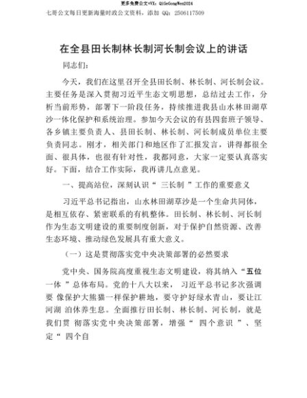 【七哥公文】2025年:【七哥公文】在全县田长制林长制河长制会议上的讲话+更多免费公文+VX:QiGeGongWen2024+更多免费公文+VX:QiGeGongWen2024