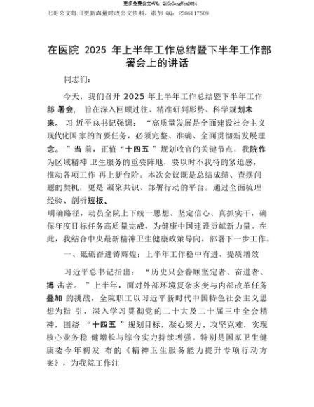 【七哥公文】2025年:【七哥公文】在医院2025年上半年工作总结暨下半年工作部署会上的讲话+更多免费公文+VX:QiGeGongWen2024+更多免费公文+VX:QiGeGongWen2024