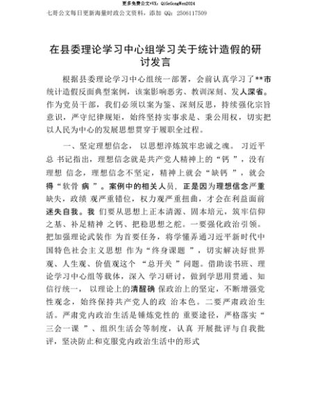 【七哥公文】2025年:【七哥公文】在县委理论学习中心组学习关于统计造假的研讨发言+更多免费公文+VX:QiGeGongWen2024+更多免费公文+VX:QiGeGongWen2024