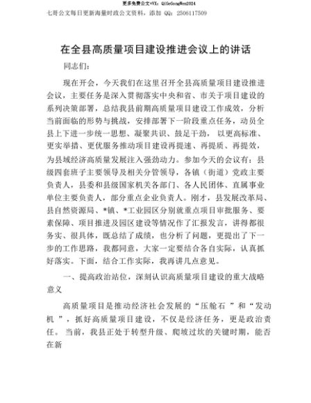 【七哥公文】2025年:【七哥公文】在全县高质量项目建设推进会议上的讲话+更多免费公文+VX:QiGeGongWen2024+更多免费公文+VX:QiGeGongWen2024