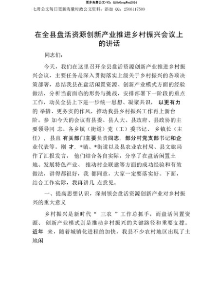【七哥公文】2025年:【七哥公文】在全县盘活资源创新产业推进乡村振兴会议上的讲话+更多免费公文+VX:QiGeGongWen2024+更多免费公文+VX:QiGeGongWen2024