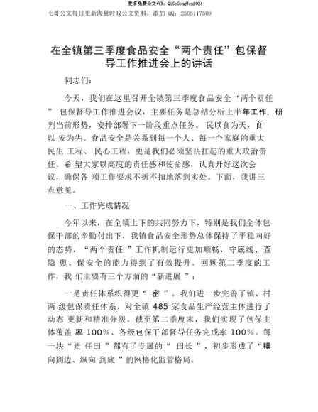 【七哥公文】2025年:【七哥公文】在全镇第三季度食品安全“两个责任”包保督导工作推进会上的讲话+更多免费公文+VX:QiGeGongWen2024+更多免费公文+VX:QiGeGongWen2024
