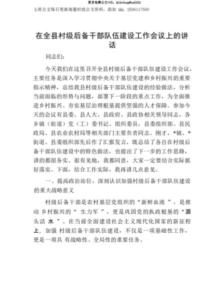 【七哥公文】2025年:【七哥公文】在全县村级后备干部队伍建设工作会议上的讲话+更多免费公文+VX:QiGeGongWen2024+更多免费公文+VX:QiGeGongWen2024