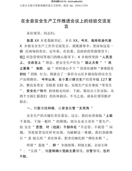 【七哥公文】2025年:【七哥公文】在全县安全生产工作推进会议上的经验交流发言+更多免费公文+VX:QiGeGongWen2024+更多免费公文+VX:QiGeGongWen2024