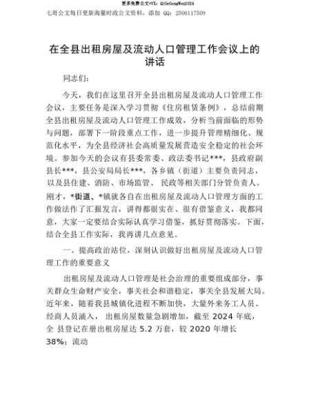 【七哥公文】2025年:【七哥公文】在全县出租房屋及流动人口管理工作会议上的讲话+更多免费公文+VX:QiGeGongWen2024+更多免费公文+VX:QiGeGongWen2024