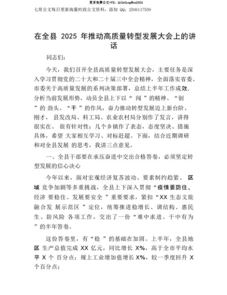 【七哥公文】2025年:【七哥公文】在全县2025年推动高质量转型发展大会上的讲话+更多免费公文+VX:QiGeGongWen2024+更多免费公文+VX:QiGeGongWen2024