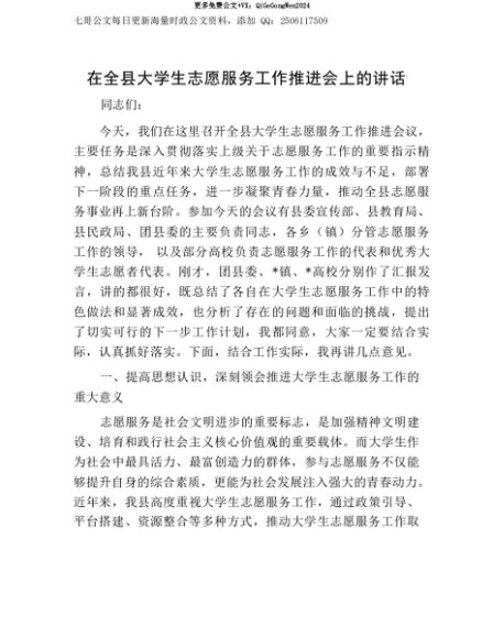 【七哥公文】2025年:【七哥公文】在全县大学生志愿服务工作推进会上的讲话+更多免费公文+VX:QiGeGongWen2024+更多免费公文+VX:QiGeGongWen2024