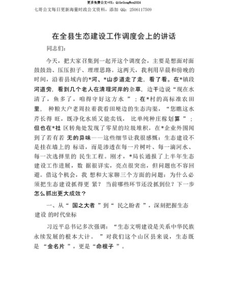 【七哥公文】2025年:【七哥公文】在全县生态建设工作调度会上的讲话+更多免费公文+VX:QiGeGongWen2024+更多免费公文+VX:QiGeGongWen2024