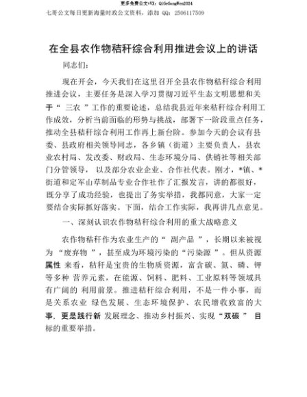 【七哥公文】2025年:【七哥公文】在全县农作物秸秆综合利用推进会议上的讲话+更多免费公文+VX:QiGeGongWen2024+更多免费公文+VX:QiGeGongWen2024