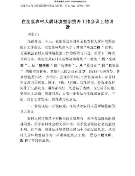 【七哥公文】2025年:【七哥公文】在全县农村人居环境整治提升工作会议上的讲话+更多免费公文+VX:QiGeGongWen2024+更多免费公文+VX:QiGeGongWen2024